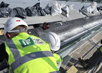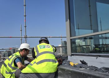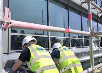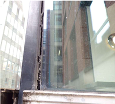 The image on the left shows the faulty seals, allowing an ingress of water – these caused water damage, spreading to other components of the building. To fix this, we completely removed all seals and resealed ensuring no water would be able to enter; Providing a solution the ongoing problems with the building. To do this, the team removed and reinstalled over 1200 panels of glass: all whilst working around a live office building.