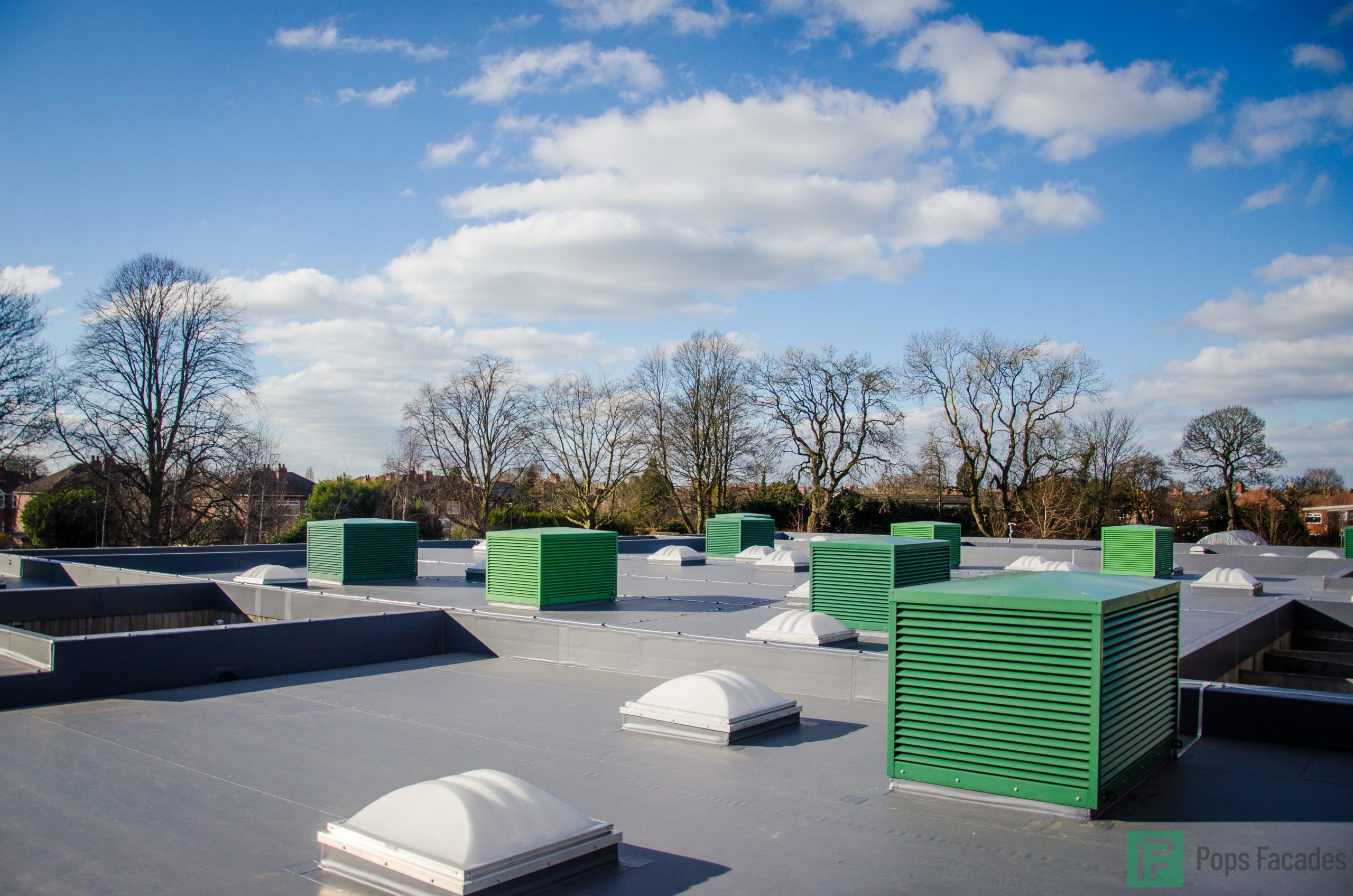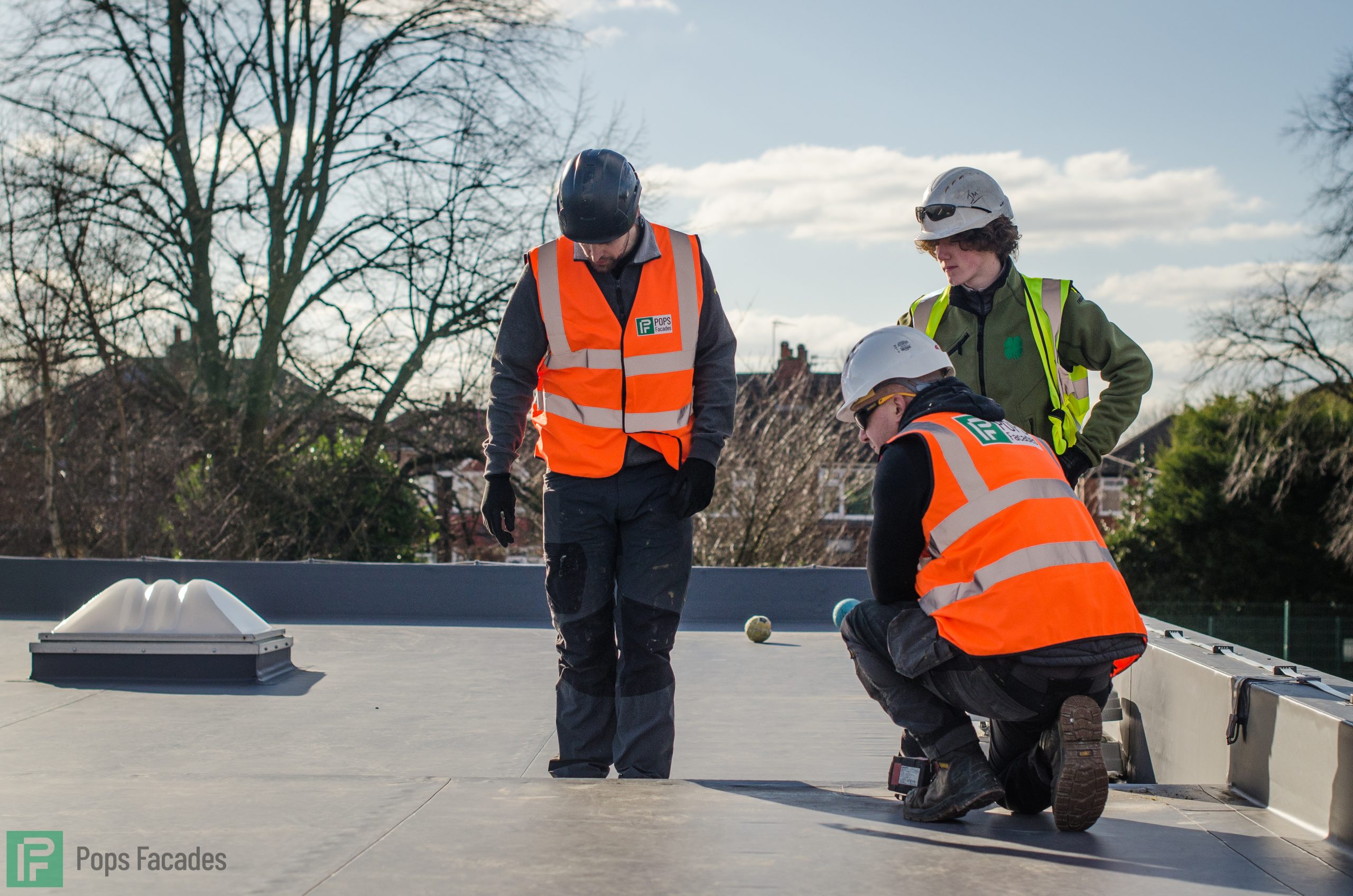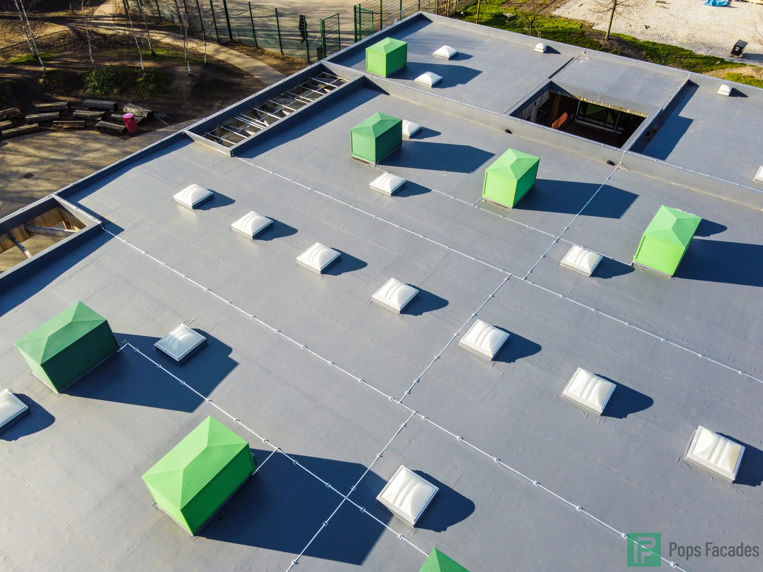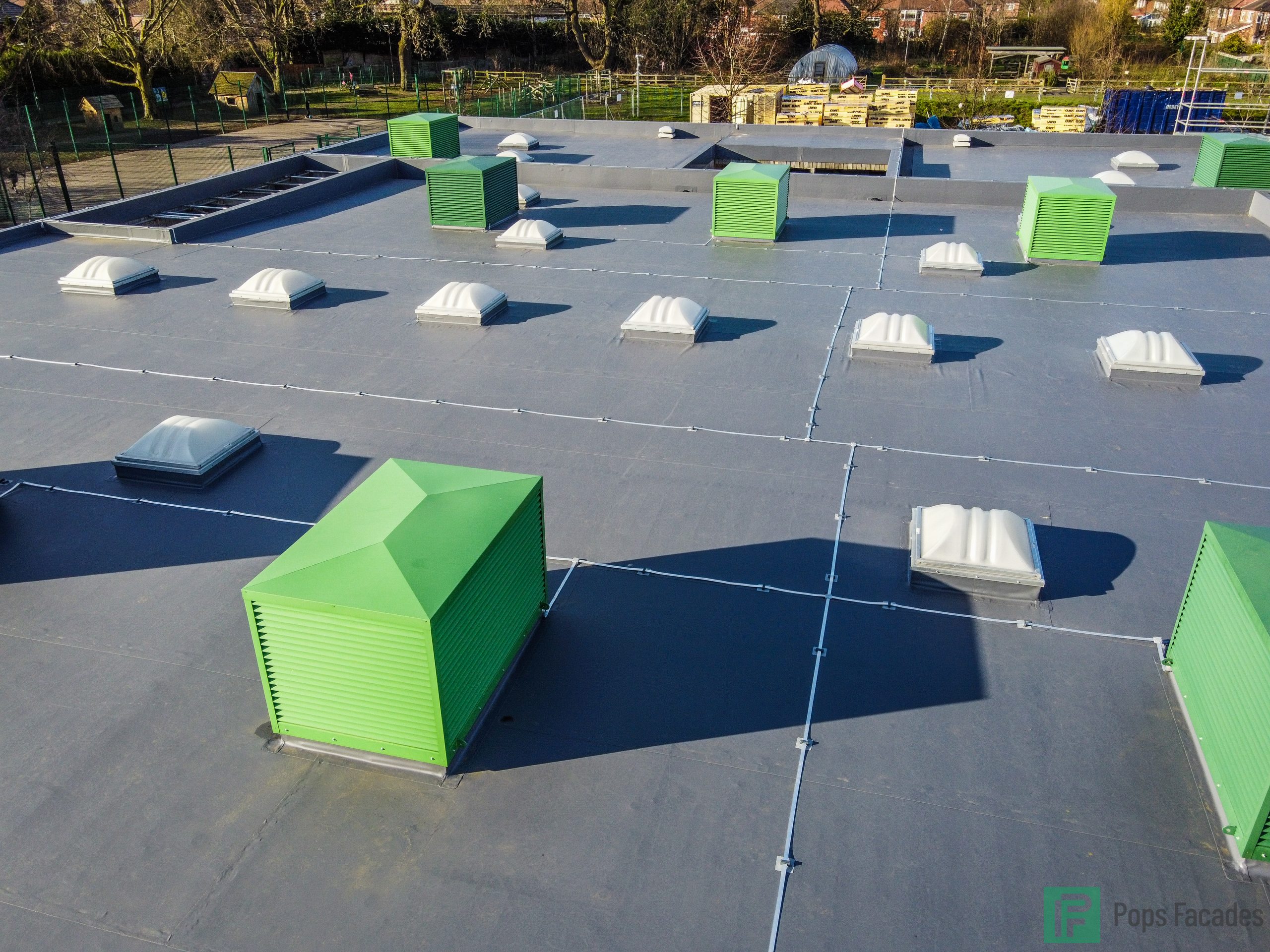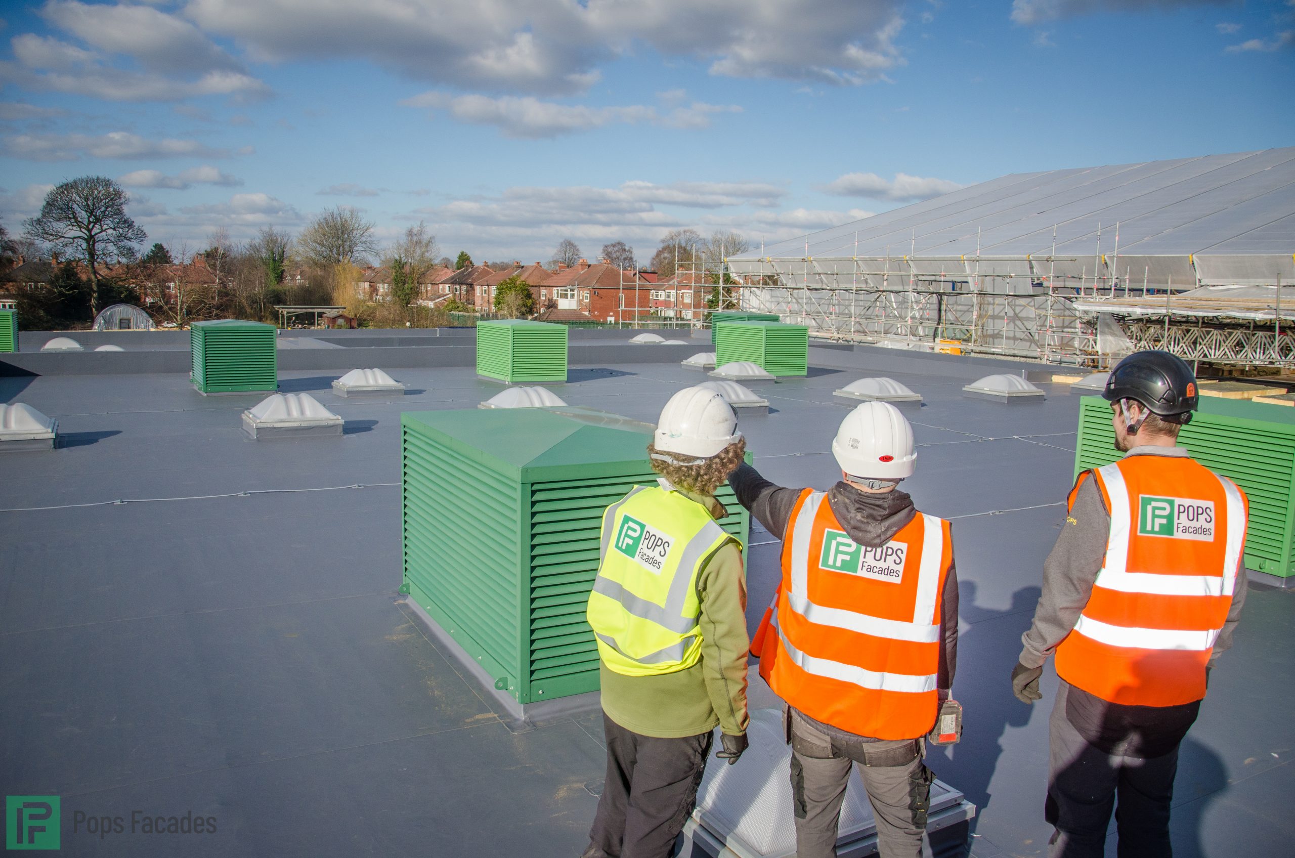 Pops Facades was employed to install the roofing system (2550m2) in an occupied school. Once the existing OSB had been removed the structural engineer, surveyed the the roof timbers and we agreed a replacement scheme prior to applying a IKO Polymeric Armourplan.